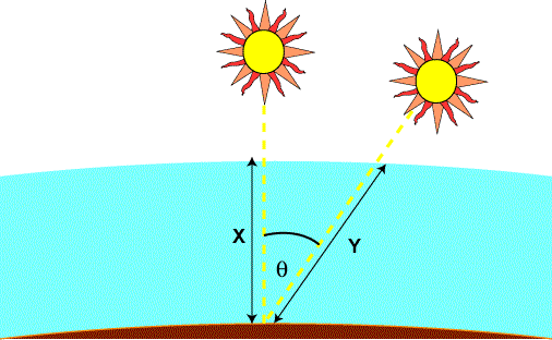 大氣質(zhì)量表示在達(dá)到地面之前,光在大氣層中必須通過的相對(duì)路徑長度(相對(duì)于垂直入射路徑),其值等于Y/X。